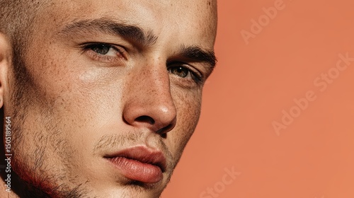 Young man with buzz cut and earrings, clean skin and direct look, on light peach background