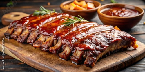 A juicy rack of smoked pork ribs glistening with a sweet and tangy BBQ sauce glaze, barbecue, bbq sauce, barbecue, bbq sauce