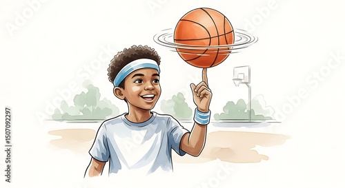 A young boy is spinning a basketball with a smile on his face