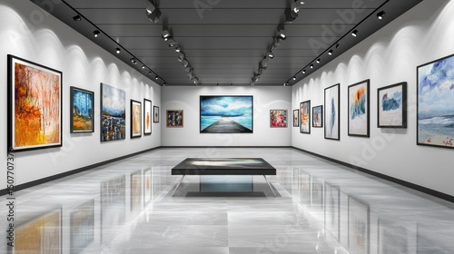 Modern art gallery interior, many framed paintings on white walls, polished floor, spotlight lighting