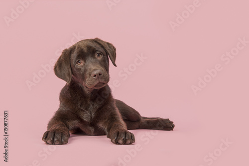 Four months old brown labrador retriever puppy lying down seen from the front looking at the camera on a pink background