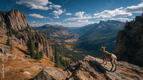 Bighorn sheep climbs rocky ledge in breathtaking Rocky Mountain valley vista