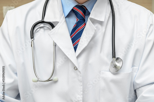 Tło medyczne, lekarz w białym kitlu że stetoskopem z bliska