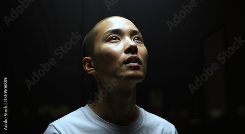 Asian man looking up contemplative expression dark background dramatic lighting. Male portrait thoughtful mood introspective meditation spiritual wellness concept