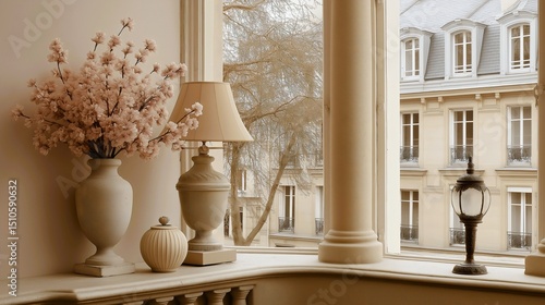 Elegant parisian interior windowsill styling with Classical column cherry blossom arrangement ceramic vases table lamp overlooking traditional haussmann architecture.