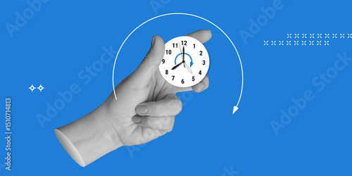 Time tracking, focus, work time concept. Hand holding watch with hand symbolising passage of time. Minimalist art collage