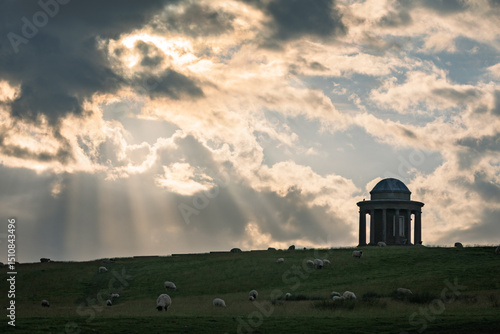 Sunset behind Brightling temple on the high weald east Sussex south east England UK