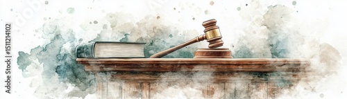 A judge"s gavel and law book sit on a wooden desk, symbolizing justice and legal proceedings in a watercolor style.