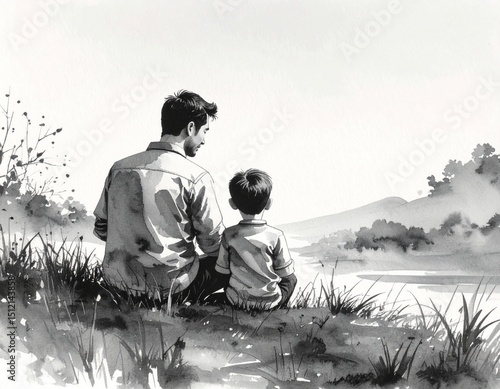 Ojciec i syn siedzą obok siebie na łące wspólnie spędzając czas w plenerze. Dzień ojca, ojcostwo. Czarno-biały rysunek, ilustracja, akwarela, szkic