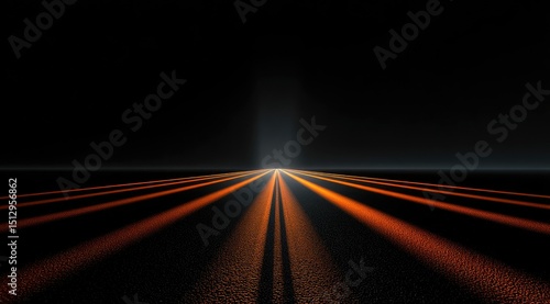 Glowing orange lines converge towards a distant light source on a dark, seemingly endless road or path. The overall effect is one of depth and mystery