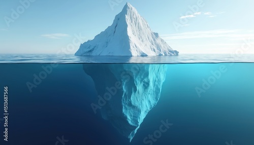 Large iceberg floats in ocean. Underwater view reveals hidden part. Climate change, global warming concept. Symbol of danger, risk, environment issues, melting ice, rising sea level.