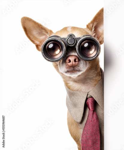 A chihuahua wearing business attire and holding binoculars is peeking around the corner, against a white background .