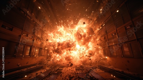 Una explosión cataclísmica ilumina un corredor industrial abandonado, sumiéndolo en un caos de fuego y metal retorcido.