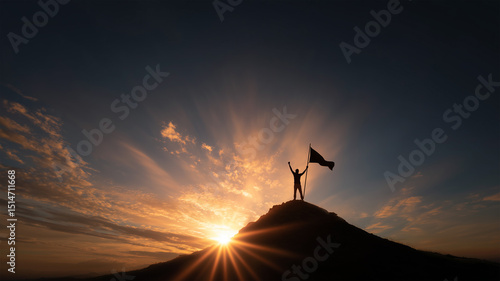 山頂で勝利を掲げる男性のシルエット