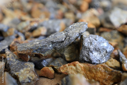 Antimony (Sb) mine, mining. Stibnite ore (antimonite, antimony trisulfide) background. Critical mineral, raw material. Metal used solder, bullets, plain bearings, alloys, lead-acid batteries