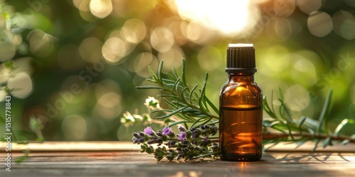 A bottle of essential oil with a sprig of lavender and rosemary on a wooden table in a natural setting.