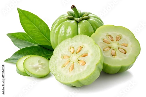 Fresh garcinia cambogia fruit with leaves isolated on white background