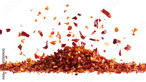 A crisp close up of dynamic motion red chili pepper flakes flying, alongside a neat accumulation of chopped paprika isolated on transparent or white background.