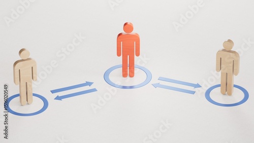 Three dolls and golden arrows. Concept of interpersonal conflict management and conciliator.3D rendering on whitebackground.