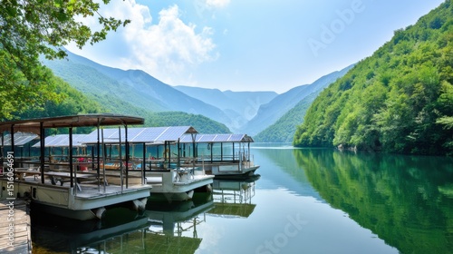 Tranquil lakeside retreat with calm green-blue water reflecting lush hills and mountains under a clear blue sky with fluffy white clouds. Wooden dock extends into the lake, moored with eco-friendly po