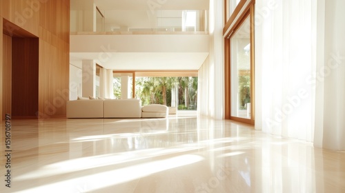 An elegant, minimalistic living room featuring large windows that allow abundant natural light, creating a spacious and inviting atmosphere for relaxation and comfort.