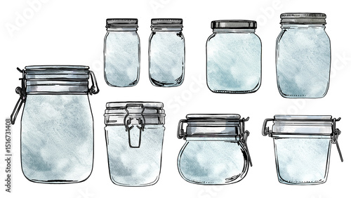 Glass jars for jams and fermented vegetables. Kitchen tools and equipment. Ink and watercolor drawing on white background.