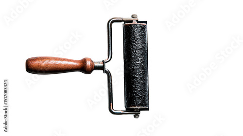 A detailed photograph of a vintage printmaking brayer, isolated on a black backdrop.