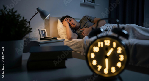 A man struggles with insomnia at night, lying awake in bed and staring at the clock. This image represents sleep disorders, anxiety, and restless nights—ideal for mental health or wellness content.