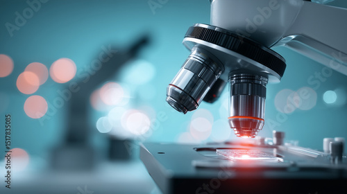 Close-up of microscope lens analyzing illuminated sample, soft bokeh background. Precision scientific glass-metal instrument for medical research, clinical labs, biotechnology & forensic analysis