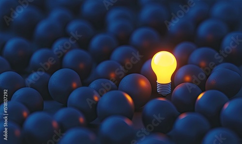 Unique glowing light bulb amongst many dark ones