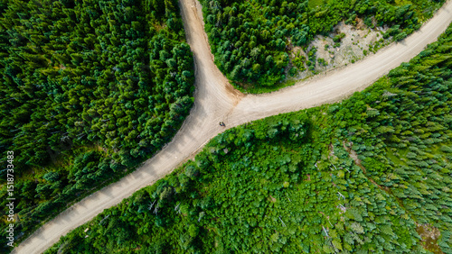 Bird's-eye view of the crossroads of dirt tracks crossing the boreal forest