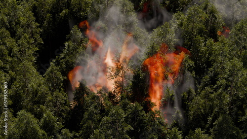 Flames engulf trees in a forest during a hot afternoon as smoke rises. 3d render