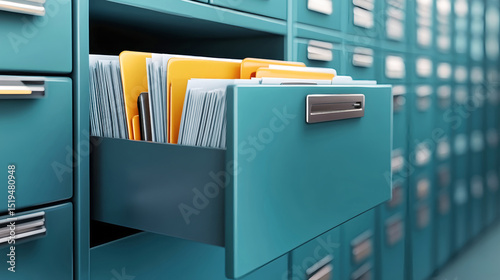Office storage drawer filled with organized documents in a sleek gray and turquoise environment