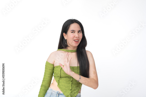 Teen girl raises her hand in a stop sign and moving away while giving a disapproving expression, clearly annoyed or dismissive. Studio shot.