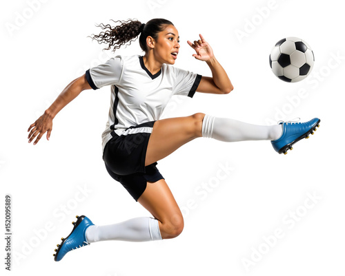 Pro female football player doing jumping air control during kick attempt on a midair ball