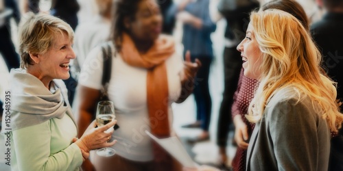 Two women engage in a lively conversation at a social event. The blonde woman smiles while holding a glass, and the other woman, with dark hair, listens intently. Socializing and networking are key.