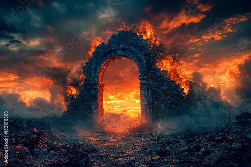 Ancient stone archway surrounded by fire and smoke at dramatic sunset
