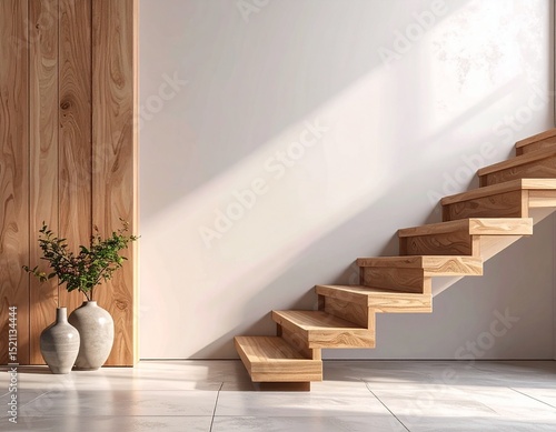 Drewniane schody w nowoczesnym, białym wnętrzu