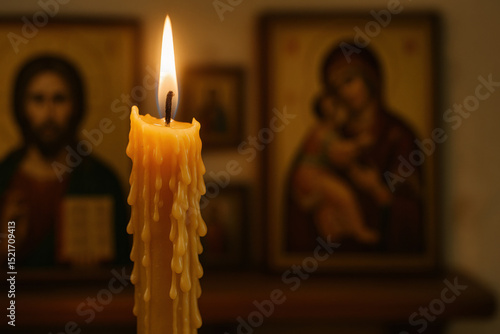 Candle burning in front of orthodox religious icons, symbolizing faith, spirituality, and sacred rituals in traditional worship