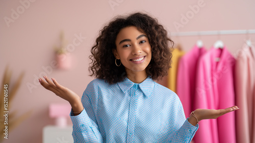 Smiling woman shrugging in front of a wardrobe filled with colorful clothes.