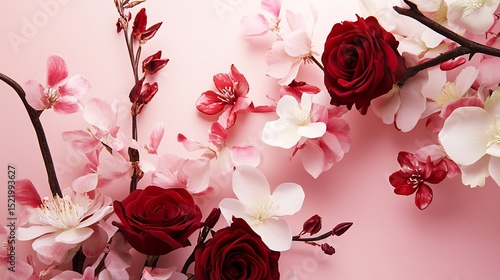 Close up of red roses and white and pink blossoms on a light pink background in a floral arrangement