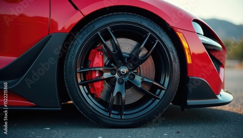 Modern sports car's sleek alloy wheel and tire assembly , dynamic, speed, travel
