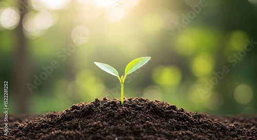 New Life Sprouting A Tiny Seedling Emerging from Rich Soil, Basking in the Warm Sunlight of a Vibrant Green Forest