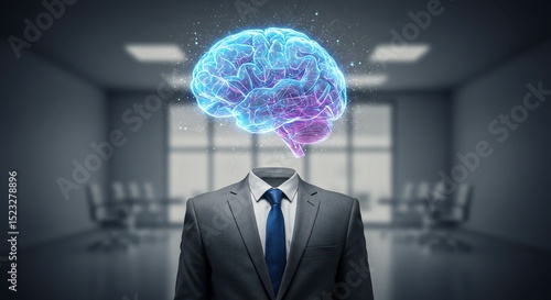 A headless figure in a dark suit with a glowing blue brain replacing the head, set in a modern, softly lit office with chairs and a large window, conveying themes of intellect and innovation.