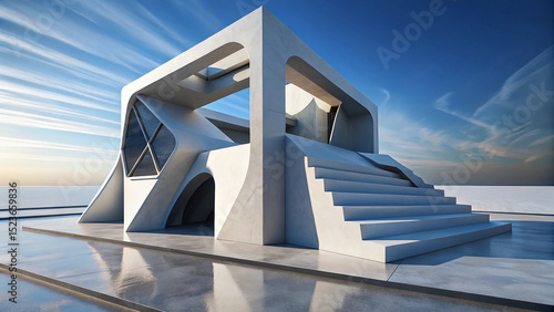3d render of abstract modern futuristic look geometry society architecture with empty cement floor, minimal white interior exterior against blue sky background