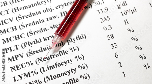 Strzykawka z krwią leży na wynikach badań, pełna morfologia