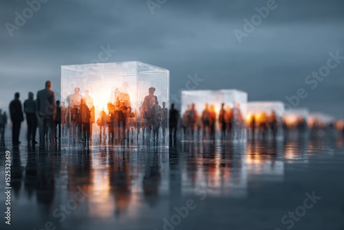 Conceptual art of isolated human figures enclosed in transparent cubes emitting light in surreal reflective environment perfect for topics of isolation, society and digital identity