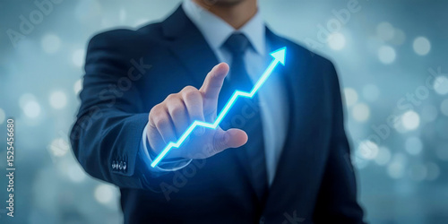 Business professional points at a digital growth chart representing increased success and profitability