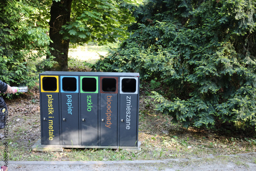 Kolorowe pojemniki do selektywnej selekcji odpadów, ekologia, segregacja śmieci.