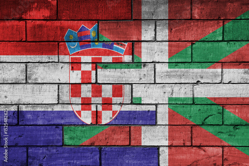 colourful painted big national flag of croatia and flag of basque country on a massive old brick wall background. concept